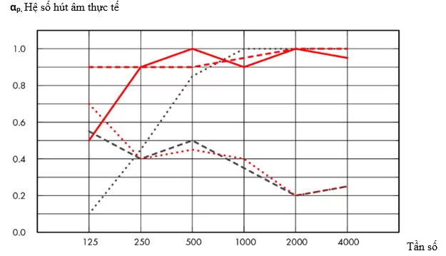 Kết quả kiểm tra theo tiêu chuẩn EN ISO 354. Phân loại cấp độ theo tiêu chuẩn EN ISO 11654 và giá trị đơn lẻ cho hệ số suy giảm tiếng ồn NRC và hệ số hút âm trung bình SAA theo tiêu chuẩn ASTM C 423.