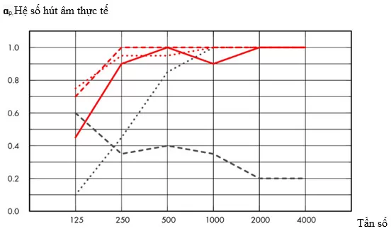 Kết quả kiểm tra theo tiêu chuẩn EN ISO 354. Phân loại cấp độ theo tiêu chuẩn EN ISO 11654 và giá trị đơn lẻ cho hệ số suy giảm tiếng ồn NRC và hệ số hút âm trung bình SAA theo tiêu chuẩn ASTM C 423.